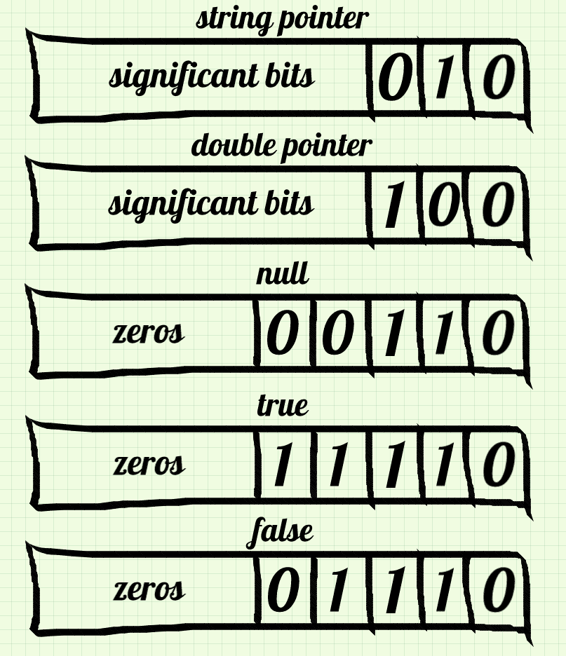 One of JavaScript’s implementations, Google’s V8 engine, actually uses tagged pointers for dynamic typing. Moreover, it uses the same way of storing integers as above!
